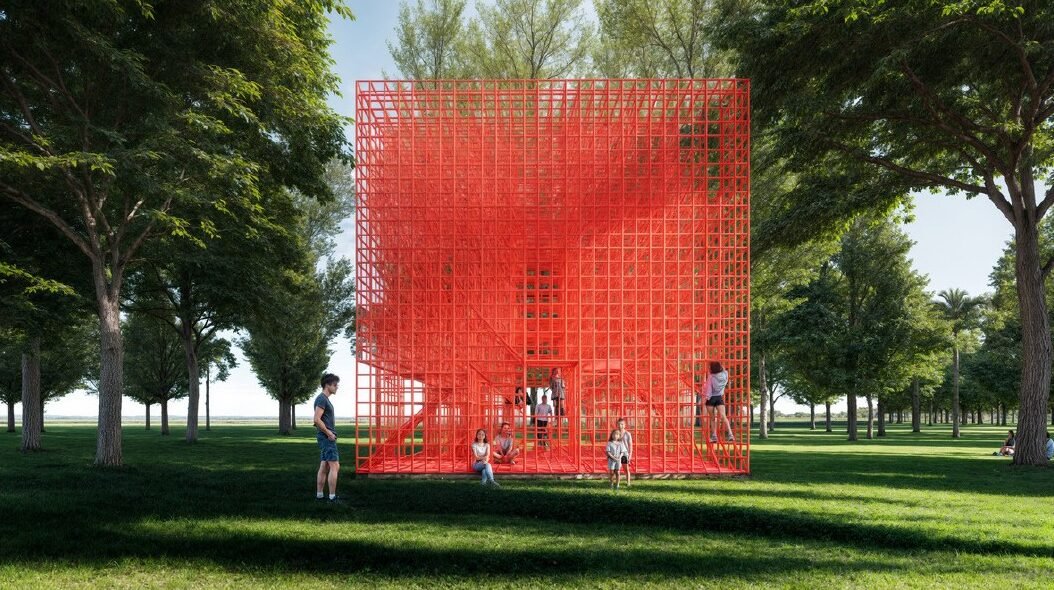 This is the “translucent maze” — a bright red grid-like structure that can be seen through. People will catch glimpses of one another as they move within the structure, creating moments of unexpected connection or separation. I intend this space to serve as a conversation between solitude and togetherness, between presence and absence — a space where those boundaries gradually dissolve and open opportunities for us to reconsider our existence in relation to one another.